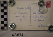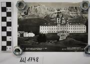 Abstract: Cartolina, fotografia, bianco e nero. Motivo: Esterno del monastero/luogo di pellegrinaggio Santuario della Madonna di Pietralba ("Maria Weißenstein") con vista sul Catinaccio. Produttore/editore: Foto Fränzl, Bolzano. Numero della cartolina: 5159 N. La fotografia ritrae il monastero e luogo di pellegrinaggio Santuario della Madonna di Pietralba sul Monte Regolo presso Monte San Pietro (comune di Nova Ponente) che si trova al sud-est di Bolzano, con vista a sud-est verso il Catinaccio (massiccio montuoso delle Dolomiti). L'immagine mostra le torri della chiesa conventuale (iniziata nel 1638, consacrata nel 1673, restaurata nel 1753 e rinnovata nel 1870 e nel 1954) sul retro dell'edificio e il semplice edificio conventuale a tre piani (costruito tra il 1719 e il 1722) in primo piano. La facciata, ridisegnata nel 1753, presenta due torrette, un timpano e una scalinata con balaustra davanti all'ingresso. A sinistra nella foto si trova la locanda Pietralba/Weißenstein (iniziata nel 1708 e da allora molto modificata). [Informazioni: Weingartner 1991, Die Kunstdenkmäler Südtirols]. Testo sul fronte sotto la foto: "Santuario di Pietralba m. 1520 verso le Dolomiti (Bolzano) – Maria Weißenstein gg. den Rosengarten 2.981 m (Bozen)". La cartolina é stata spedita. Destinatari: "Famiglia Hans Niederwieser, San Giorgio". Mittente: "Hermann e Regina". Timbro postale di Petersberg del 24 ottobre 1961; francobollo delle Poste Italiane a 15 lire. Contenuto: "Cordiali saluti da Pietralba".