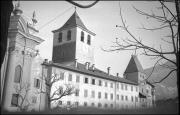Abstract: Bozen, Gries, Kloster Muri Gries, Gebäudefront mit Fenstern, zwei Türme, links Teilansicht der Stiftskirche.