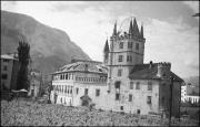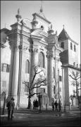 Abstract: Bozen, Gries, Kloster Muri Gries, Turm. Fassade der Stiftskirche, Säulen, Fenster mit Bogenabschluß, davor Personen