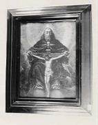 Abstract: Kreuzigung mit Heiligen (hl. Theresia und hl. Dominikus ?) und Fegefeuer. An beiden S. Engel mit beschrifteter Schriftrolle; l.:'O Mensch mit der Communion den Seelen hilft zur Himmelcron durch Messopfer auch zumall kannst du Sie erlessen ...' r.:'O Mensch den Seelen bringe mit dein Gebett das macht sie frei, durch welch der Barmherzigkeit fuehr sie auch zu Seligkeit' u.l. Beschriftung:'Erbarmet euch meiner, erbarmet euch meiner aufs weingst meine ... , Job. C, 19 v. 7' ; u.r. Beschriftung:'Selig die Barmhertzen den Sie werden Barmherzigkeit erhalten, Math. C. 5 V.7' lt. Karteikarte von Bussjäger Rätselhaft