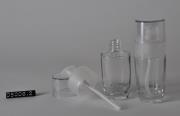 Abstract: Farblose, leicht bauchige Glasflasche mit Schraubgewinde, dazu satinierter Dispenser und klare Schutzkappe aus Kunststoff. Geriffelter Bodenrand. Dient zur Aufbewahrung und Abgabe von dünnflüssigen und viskosen Medien. Musterflaschen, wurden nicht ins Sortiment aufgenommen.