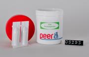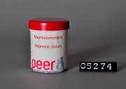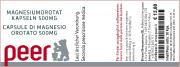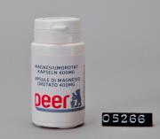 Abstract: Runde Dose aus weißem Kunststoff mit Sicherheits-Drehverschluss für Kapseln. Seitliche Naht. Boden mit geteiltem Standring. Deckel bedruckt mit Logo der Peer Apotheke, Brixen. Boden geprägt mit Volumenangabe 50 und Recycling-Code für PD-HE. Enthält 30 Kapseln zur Magnesiumorotat zu 400mg bzw. 500mg. Zu verwenden laut ärztlicher Verrdnung.