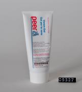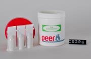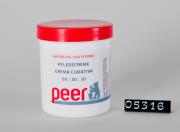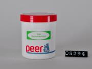 Abstract: Weiße Salbendose mit rotem Schraubverschluss aus Polypropylen (PP), mit Standring. Bodenprägung: 100, 125ml und Receyclingsymbol für PP. Enthält 100g Pflegecreme, bestehend zu gleichen Teilen aus Ultrasicc und Ultrabas. Wird in verschiedenen Mischungsverhältnissen hergestellt.