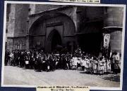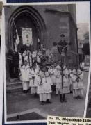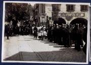 Abstract: Meran - Pfarrplatz - Kriegs- Dank- Verlöbnisprozession - Sängerchor und St. Michaelsbundknaben vor der St. Nikolaus Pfarrkirche. Vorne Prozessionsordner Pfarrgeistlicher Knottner