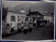 Abstract: Meran - Untermais - Fronleichnamsprozession auf der heutigen Romstraße - Die Laberser und Freiberger Volksschüler mit der Herz Jesu- Statue. Mit im Bild Schulleiter Auer