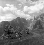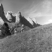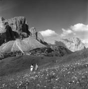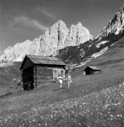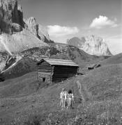 Abstract: Zwei Mädchen beim Spazieren am Grödner Joch. Im Hintergrund das Mittagstal.