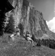 Abstract: Zwei Mädchen am Grödner Joch sitzend in einer Wiese.