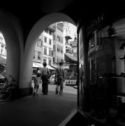 Abstract: Detailansicht des Obstmartes in Bozen. Im Vordergrund das Schuhwarengeschäft Principe.