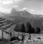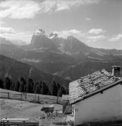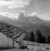 Abstract: Blick zur Langkofelgruppe von der Raschötz Alm aus. Im Vordergrund eine Almhütte.