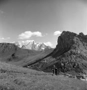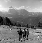 Abstract: Blick zur Langkofelgruppe von der Raschötz Alm aus. Im Vordergrund Wanderer.