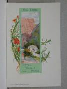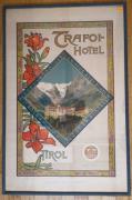 Abstract: Poster incorniciato inerente il Trafoi - Hotel/Tirolo. -Associazione per la costruzione di alberghi alpini in Tirolo, 1905 ca. Tema grafico: disegno dell'hotel di Tony Grubhofer, contornato da una fascia di foglie; a sinistra, tre gigli (lilium bulbiferum) ed in basso, a destra, un monogramma, probabilmente dell'associazione.