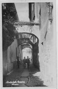 Abstract: Meran : Das Delago - Haus am Kornplatz. Blick von der Meinhardstraße mit Durchgang zum Kornplatz. Abgebrochen im Jahr 1902.