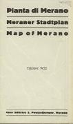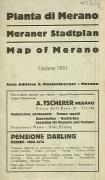 Abstract: Piantina della città di Merano (color verde) con legenda costituita da un elenco di alberghi, pensioni e locande, edifici pubblici e trasporti urbani (linea dalla stazione a Piazza Fontana). Sul retro, una piccola cartina con le mete escursionistiche, annunci di alberghi e ristoranti, un elenco delle strade e il testo: "Merano come centro per i canoisti e le canoe". Piazzole campeggi".