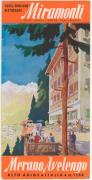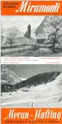 Abstract: Opuscolo pubblicitario, a colori, inerente l'Hotel Miramonti, Merano - Avelengo, propr.: fam. K. Huber, riporta illustrazioni in b/n e a colori (stube tirolese, sala da pranzo, camera doppia con bagno, chiesa di Santa Caterina, skilift sullo Stilhang/Steilhang(?) e Zuegghütte/rifugio). All'interno, una cartina di Avelengo e dei sentieri escursionistici nonchè un orario della funivia di Avelengo. Lato ant.: illustrazione grafica a colori dell'hotel con terrazza e ospiti.