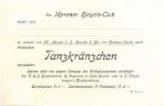 Abstract: 1 Einladungskarte zum Tanz vom Meraner Bicycle - Club am 25. Jänner 1898 im Kurhaus Saal. Die Karte ist nicht adressiert. Zum Ballcomité gehören: Ernst Hornung - Club Vorstand, Franz Leibl Vizevorstand, Max Braun Schriftwart, W. Herzum Kassier, Oskar Ellmenreich 1. Fahrwart, A. Freyman 2. Fahrwart, Dr. Austerlitz, R. Knabl, Dr. von Sölder, Fr. Unterer, Carl Wolf. Motiv RS: Darstellung eines Adlers auf einem antiken Fahrrad auf einer Mauer mit Zinnen, darunter die Schrift "Meraner Bisycle Club".