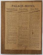 Abstract: 1 Hausordnung des Hotel Palace (früher Palast Hotel) in Meran aus dem Jahr 1923 in ital., dt. und engl. Sprache. Das Blatt ist auf 1 Holzplatte geklebt, vermutlich die Tür eines Kleiderschranks in einem Zimmer des Hotels. Der Schrank befand sich bis 2020 im Stadel vom Berger-Hof in Tscherms. Die Hausordnung beinhaltet 13 Punkte, u.a. Luxussteuer, Kurtaxe, Trinkgeld, Bedienung, Pension, Heizung, Fremdenwäsche etc. mit Preisangaben der versch. Dienstleistungen bzw. Steuern /Taxen.