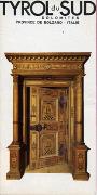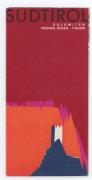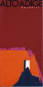 Abstract: Opuscolo pubblicitario, inerente l'Alto Adige, con cartina panoramica di Berann (prospettiva dal Brennero verso sud); riporta numerose fotografie di donne in tipico costume tradizionale, tra le quali, la foto di una donna in costume festivo mentre nuota (!) con un cesto colmo d'uva. Motivo: torre stilizzata (?) del castello davanti a montagne arancione-rosa e sfondo rosso. Sul retro, la porta d'ingresso pr. Castel Velturno.