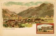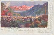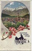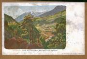 Abstract: Postkarte koloriert: Stadtansicht Meran, gegen Norden 'Meraner Ostergruss' 'No.309. Verl. Reisch, Meran'