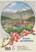 Abstract: 150 Jahre Kurstadt bzw. Kurort Meran. Jubiläumskarte. Stadtansicht nach einem Aquarell von F.A.C.M. Reisch