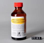 Abstract: Braune Enghalsflasche (EURO Med-Flasche) mit rotem Schraubverschluss für Expectorans Hustensaft. Boden mit geriffeltem Standring und leicht nach oben gewölbt. Bodenprägung. Vorgedrucktes selbstklebendes Etikett mit Logo der Stadtapotheke in Brixen. Auf halbrundem, gelben Grund Produktname schwarz eingedruckt. Rückseite Etikett mit Herstellungsdatum (04/2007), Verbrauchsdatum, Preis und Barcode. Hergestellt bis 2007