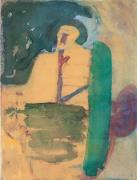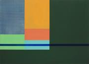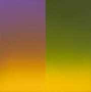 Abstract: Dipinto ad acrilico su tela quadrata. La metà superiore è divisa verticalmente in un campo lilla ed un campo verde che sfumano entrambi nel giallo nella parte inferiore.