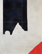 Abstract: Tempera su tela a fondo grigio con una forma astratta nera in alto a destra ed un angolo dipinto di rosso in basso a sinistra.