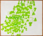 Abstract: Dipinto a tempera su tela a fondo bianco, con una composizione di segni verdi simili a foglie. Il dipinto è incorniciato con listelli in legno naturale.
