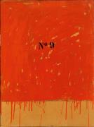 Abstract: Smalto color arancio-rosso su carta da pacco marrone, applicata su tela. Al centro la scritta nera "N°9". Il colore è dato a pennellate, mentre nella parte bassa del dipinto, cola sullo sfondo della carta da pacco marrone. Data di esecuzione dell'opera: metá anni Settanta.