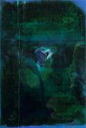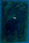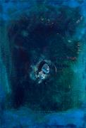 Abstract: Opera in 4 parti. Tecnica mista nei toni del blu (materia plastica, carta di giornale, lacca e colore) su alluminio. Al centro di ciascuna opera è presente una sorta di gemma sintetica applicata al supporto con una generosa quantità di smalto trasparente.