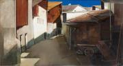 Abstract: Dipinto ad olio su tela raffigurante una stradina di Planol in Val Venosta fiancheggiata da due file di case. In primo piano un carretto di legno.