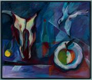Abstract: Dipinto ad olio su legno con una natura morta astratta su sfondo blu-grigio, composta da un cranio bovino, una bottiglia di vino rosso, una colomba bianca e due mele.