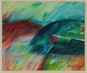 Abstract: Dipinto ad olio su tela con un paesaggio collinare astratto realizzato con pennellate tratteggiate multicolore.