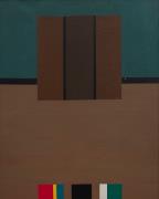Abstract: Dipinto (olio su tela) con una composizione di riquadri geometrici di varie grandezze e colori.
