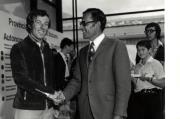 Abstract: Mann gratuliert Gustav Thöni durch Händedruck. Rechts im Bild steht ein Knabe mit Papierrolle in der Hand Schlange (ca. 1970-75).