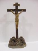 Abstract: Crocifisso su base a forma di pietra, incastonato e tinto. La croce ha dei motivi intagliati.
