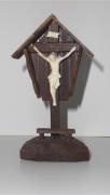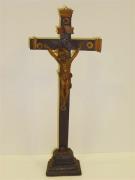 Abstract: Crocifisso con bordo in legno di abete tinto, figura di Cristo in plastica. Nella parte anteriore della base vi è una piccola panca.