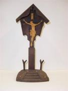 Abstract: Crocifisso con picchetto in legno di abete tinto. Nella parte anteriore della base vi è una scala con quattro gradini scolpiti.