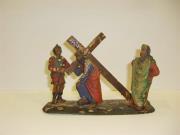 Abstract: Scultura Via Crucis in pino cembro, dipinto e tinto. Nella foto: Cristo che porta la croce - un soldato, e una persona maschile intenta ad osservare.
