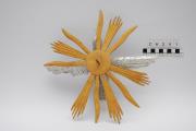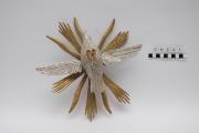 Abstract: Taube mit Strahlenkranz aus Holz. Taube versilbert, Strahlenkranz vergoldet, beides Imitate. Öse zum Aufhängen aus Metall. Zwei Strahlen sind abgebrochen und fehlen, die vorhandenen wackeln und sind sehr empfindlich.