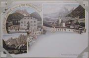 Abstract: Postkarte - Werbung - Gasthof zur Post, Besitzer Karl Stemberger - Sexten - kolorierte Lithografie zusammengesetzt aus drei Motiven. Fischleintal, Ansicht des Gasthauses zur Post und St. Veith in Sexten mit Dolomiten