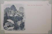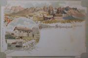 Abstract: Postkarte - Farb- Lithografie zusammengesetzt aus drei Motiven vom Schlernhaus. Die Kapelle, die Clubhütte und das Schlernhaus mit den Dolomiten im Hintergrund