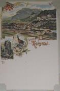 Abstract: Postkarte - Gruß aus Kufstein - Farb- Lithografie zusammengesetzt aus drei Motiven. Stadtansicht, Teufelskanzel und einer Gemse