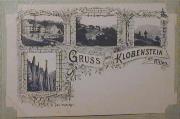 Abstract: Postkarte - Ritten - Klobenstein - Lithografie zusammengesetzt aus vier Motiven. Erdpyramiden, Gasthof Staffler, Dorfansicht und Blick zum Schlern