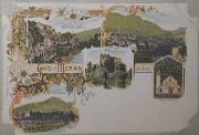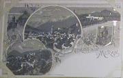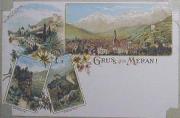 Abstract: Postkarte - Meran - Lithografie bestehend aus vier Motiven. Zenoburg, Obermais gegen Osten, der Steinerne Steg und Meran gegen Westen. ( Nach einem Entwurf von Erw. Spindler, München )