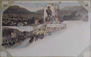 Abstract: Postkarte - Meran - Farb- Lithografie bestehend aus vier Motiven . Schloß Tirol, Mann in Tracht, Promenade und Kurhaus´und Meran gegen Westen