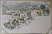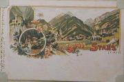 Abstract: Postkarte - Farb- Lithografie - Stans in Tirol - zusammengesetzt aus drei Motiven. St. Georgenberg, Häusergruppe (?) und Dorfansicht
