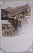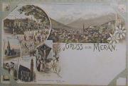 Abstract: Postkarte - Meran - Farb- Lithografie bestehend aus zwei Motiven. Kurhaus und Promenade, sowie Meran gegn Westen