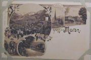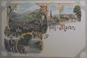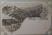 Abstract: Postkarte - Meran - Farb- Lithografie bestehend aus drei Motiven. Kurhaus u. Promenade, Zenoburg und Meran gegen Westen