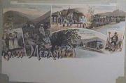 Abstract: Meran - Farb- Lithografie bestehend aus fünf Motiven. Schloß Tirol, zwei Frauen in Tracht, Landesfürstliche Burg, ehem. Gisela- Promenade mit ehem. Hotel Meraner- Hof (Meranerhof), Wandelhalle und Schütze in Tracht