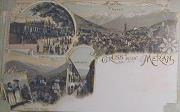 Abstract: Meran - Lithografie zusammengesetzt aus sechs Motiven: Landesfürstliche Burg, Evangelische Kirche, Laubengasse, ehem. Hotel Meraner Hof (Meranerhof), St. Nikolaus- Kirche und Meran gegen Westen